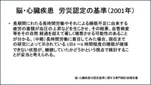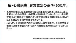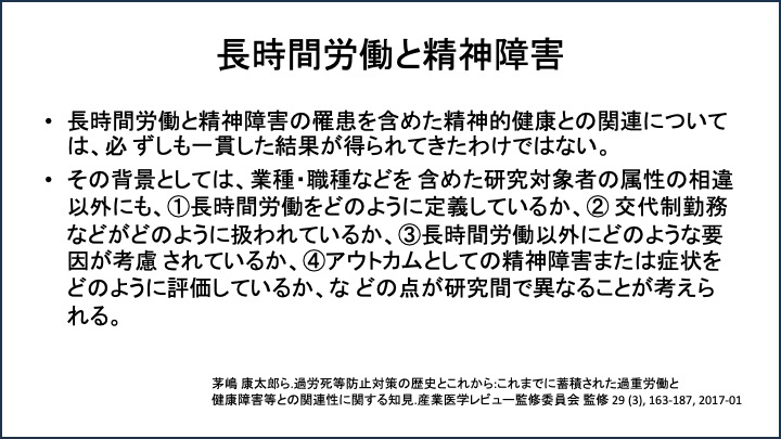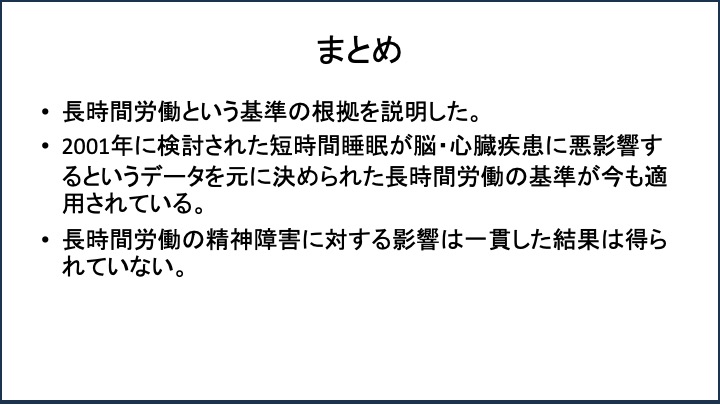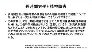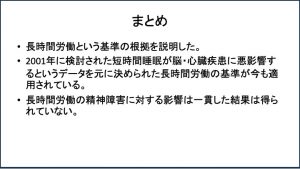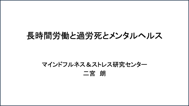今回はマインドフルネス&ストレス研究センター所属の二宮朗特任助教が「長時間労働と過労死とメンタルヘルス」のテーマで講演しました。講演ではまず労働時間がどのように歴史的に変遷して行ったのか、また時間外労働月80、100時間といった長時間労働の制限がどのような根拠をもとに設定されたのかについて触れました。その上で、長時間労働が脳・心疾患、そして精神障害の発症にどのような影響をもたらすのか、最近のエビデンスを基に説明が行われました。
